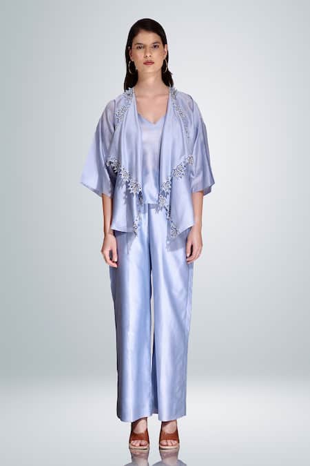 Sky blue silk chanderi cape featuring cutwork scalloped embroidery. Paired with a spaghetti inner for added comfort.