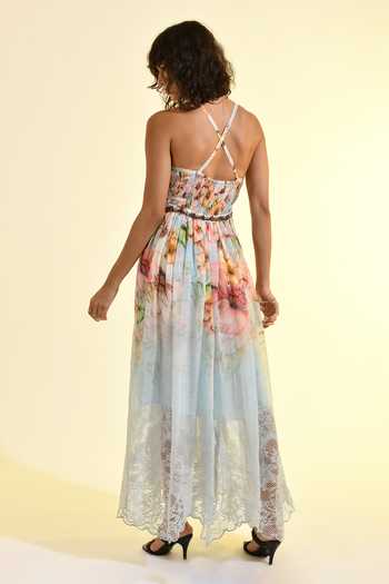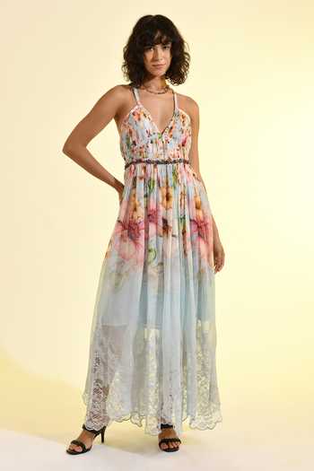Sky Blue maxi dress with floral print and pleated skirt, featuring a V-neckline and embroidered waistband. Sleeveless with adjustable spaghetti straps and a gathered waist for a flowing silhouette.