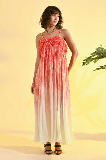 3D floral appliqué, gathered pleated skirt, spaghetti straps