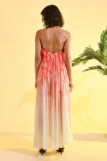 Red & ivory maxi dress featuring 3D floral appliqué on the bodice and a flowing pleated skirt. It has spaghetti straps, a square neckline and a back zipper.
