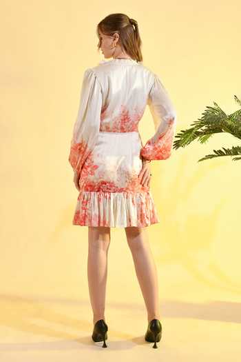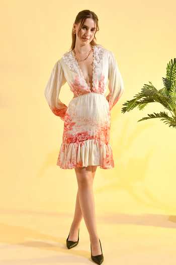 Ivory Viscose V-neck Cherry Blossom Floral Print Mini Dress