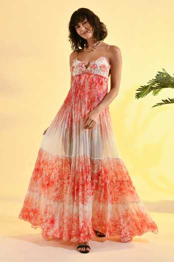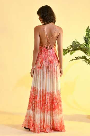 Red & ivory maxi dress features a lace-embroidered bodice and adjustable criss-cross tie-back. Made in viscose with pleated tiered skirt and floral print, finished with delicate tassel accents.