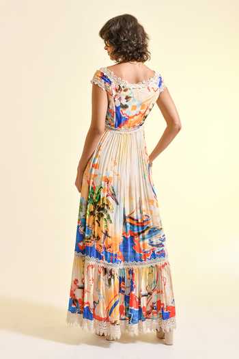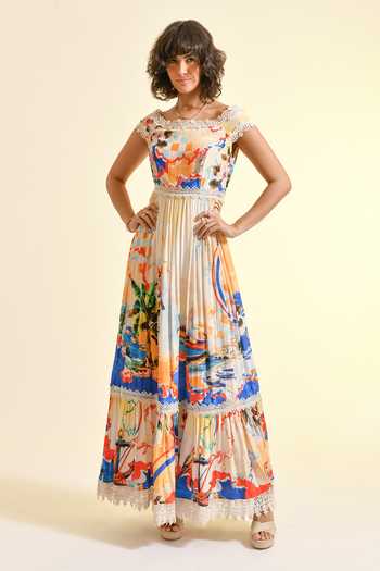 Multi Color Viscose Boat Neck, Off-shoulder Coastal Print Maxi Dress