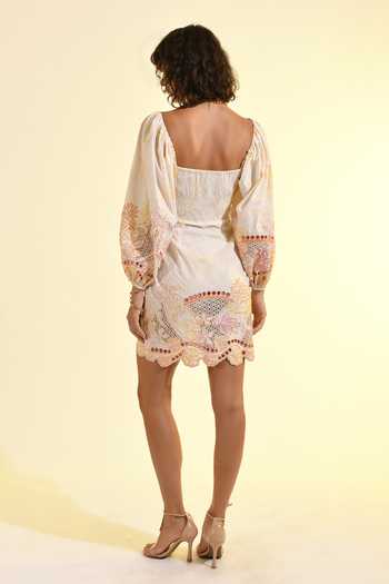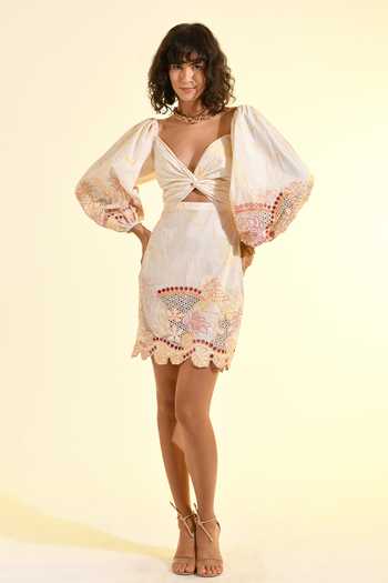 Ivory mini dress with a knotted front, waist cutout and full puff sleeves; features scalloped embroidered hem and a back zipper closure.