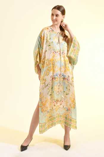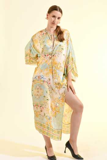 Green viscose kaftan with floral print and tassel detail. The relaxed silhouette features delicate handcrafted embroidery and short sleeves.