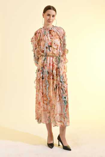 Peach viscose midi dress features ruffle detailing and a gathered neckline with a tassel tie belt. It has full sleeves and a back keyhole detail.