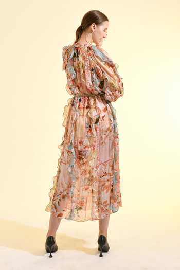 Peach Viscose High Neck Plum Paradise Ruffle Printed Maxi Dress