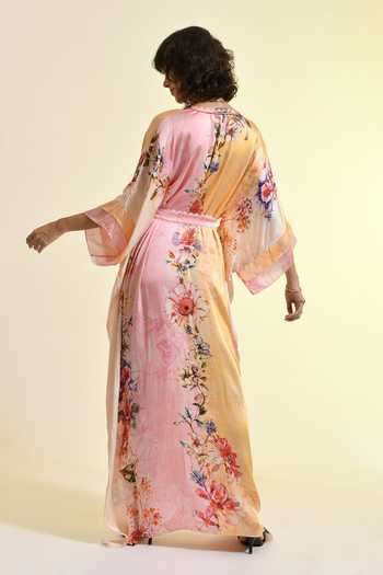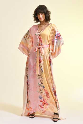 Pink Viscose V-neck Tinted Floral Print Kaftan