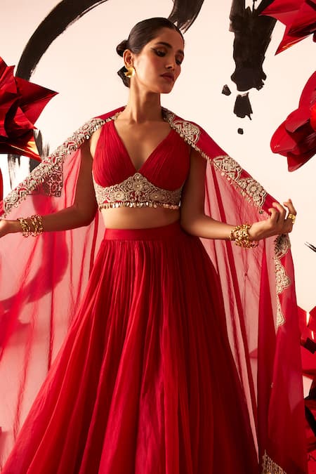 Red Organza, Georgette Embroidery V-neck Bustier Lehenga Set