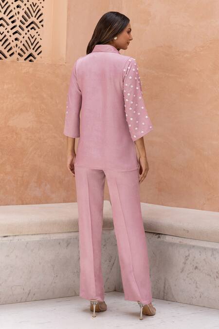 Pink Soft Linen Embellished Flower Sequins Collared Neck Sleeve Shirt