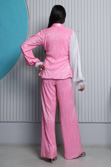 White & pink metallic lycra peplum shirt with all over plated textured pattern, color block panels & feather fringe tasselled cuff on balloon sleeves. Paired with straight fit trousers.