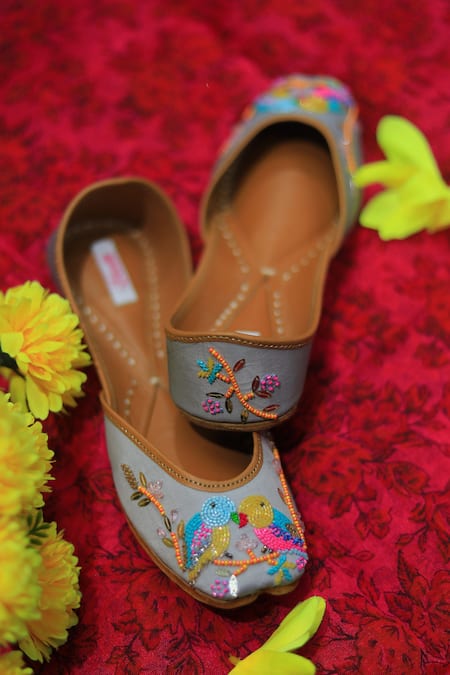 Grey handcrafted juttis featuring bird embroidery with bead, sequin & cutdana work