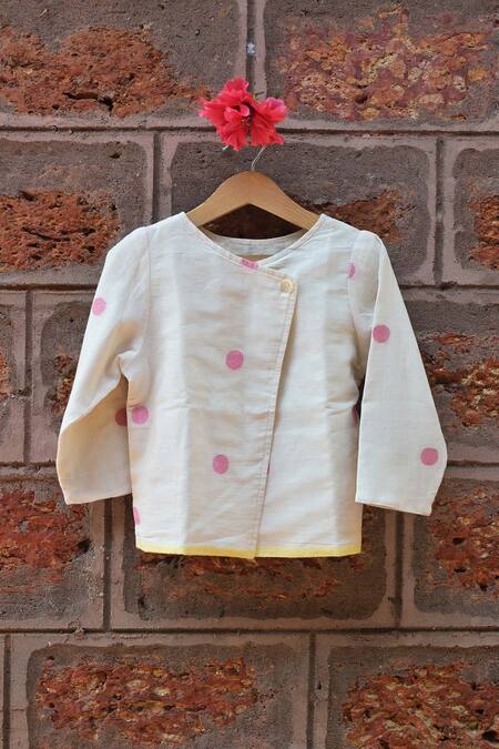 White jacket featuring handwoven cotton fabric with polka dots and a V-neckline