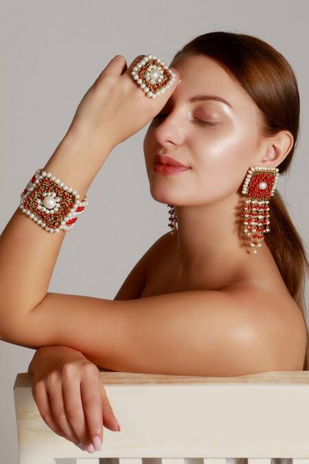 Square top design, Multi-layered tassels, Pearls & red beads embellishment