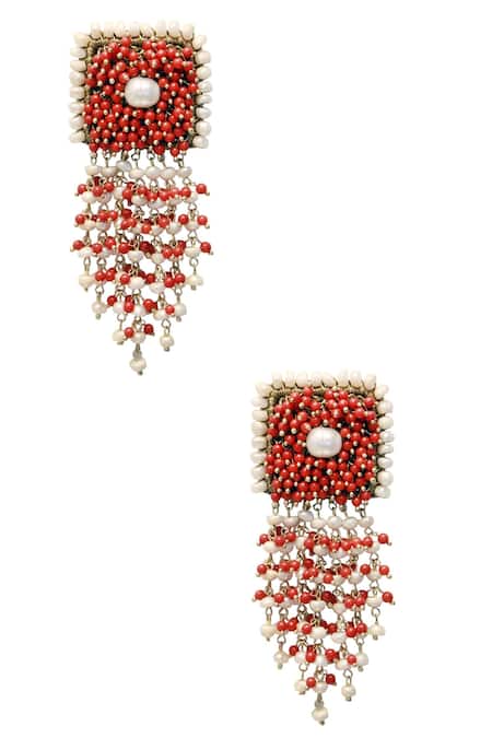 Gold danglers featuring a square top with layered tassels embellished with pearls and red beads