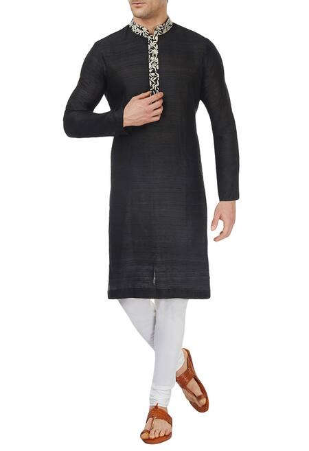 Black kurta with floral embroidered placket and band collar. Comes with white pant.