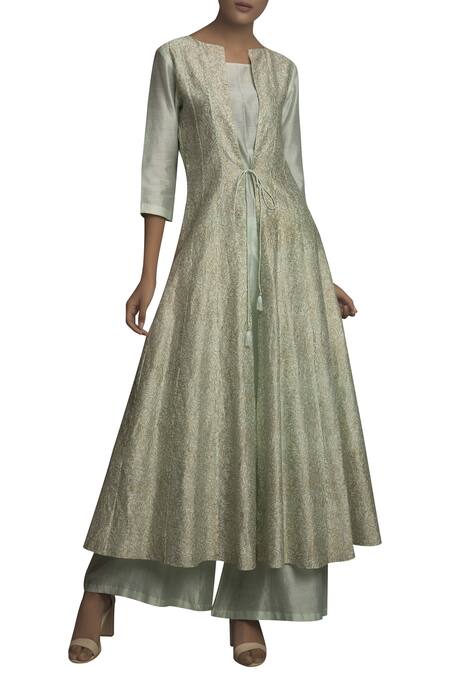 An open style jacket kurta that is accentuated with block print will be an ideal pick. It comes with matching palazzo pants.