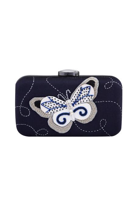 Created with perfect attention to detail, this blue silk rectangle clutch is enhanced with a 3D butterfly patch detail in faux leather and beadwork embroidery. Team up with a vibrant kurta set ensemble.