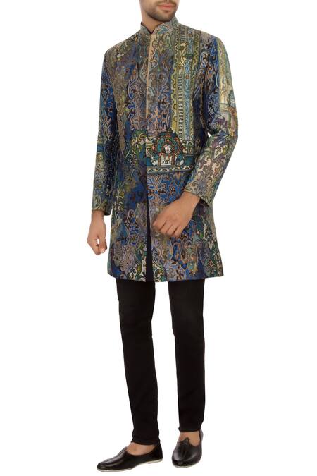 Take off the zenith of fashion by wearing this blue and green brocade bandhgala jacket. Featuring mythological motifs, it flaunts hand embroidery and applique work that gives it a stunning look. The straight silhouette and brocade make ensure comfort. It comes along with black churidar. You can wear it with mojaris for a dapper look.