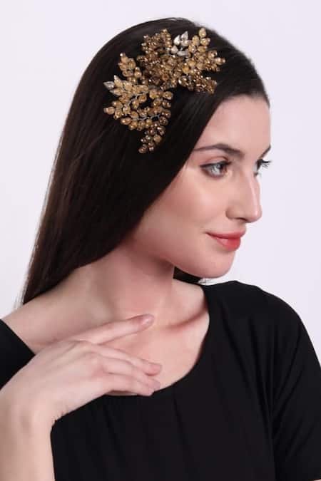 Gold hair clip embellished with artificial stones, crystals, pearls, and beads