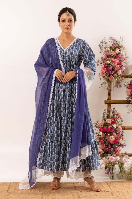 Blue botanic hand block printed anarkali with embroidered scallop bell sleeves. Paired with scallop hem white palazzo & lace work hem dupatta.
