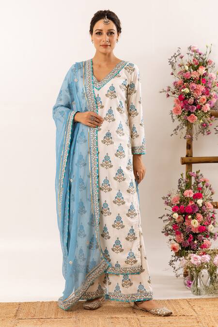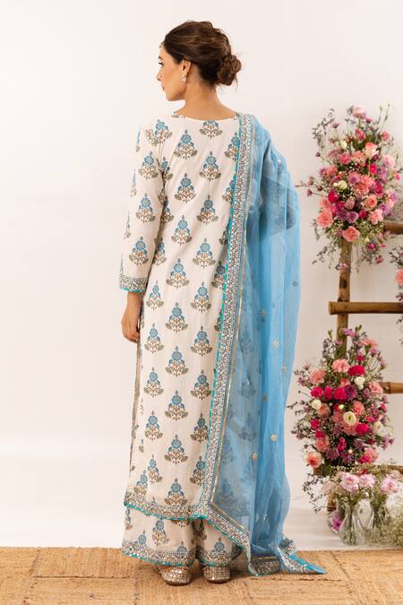 White, blue botanic hand block printed kurta with embroidered borders. Paired with printed palazzo & kota doriya embroidered dupatta.