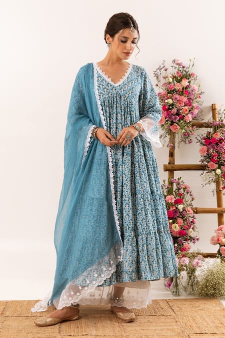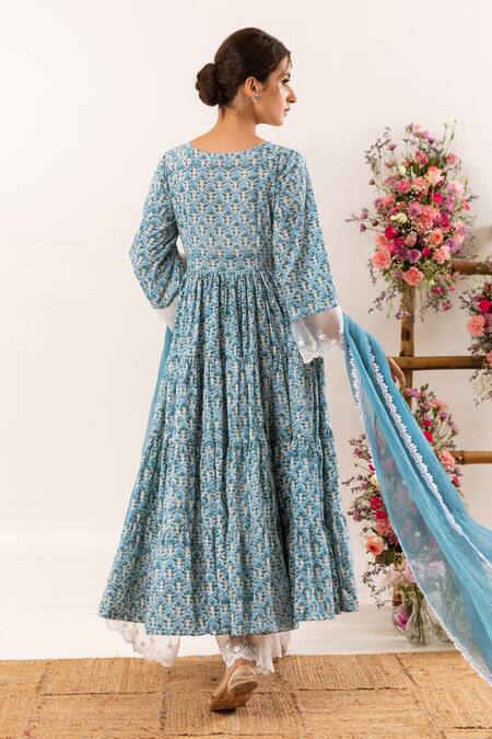 Blue botanic hand block printed anarkali with embroidered scallop bell sleeves. Paired with scallop hem white palazzo & lace work hem dupatta.