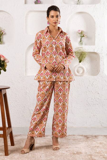 Beige shirt with botanical print & front buttons. Paired with printed pant.