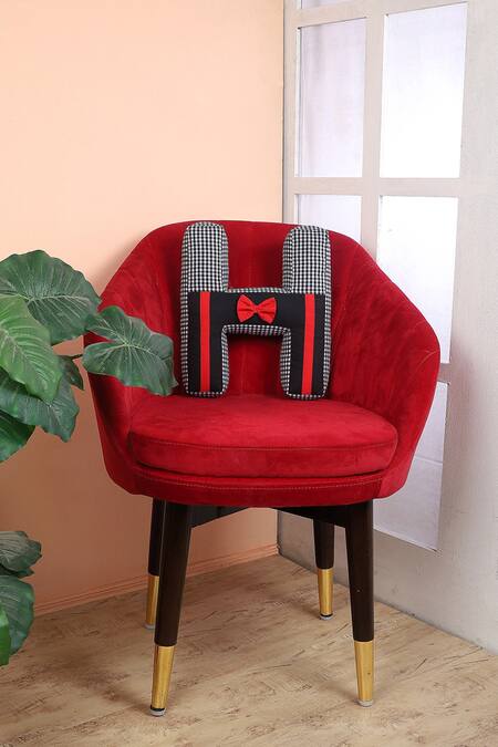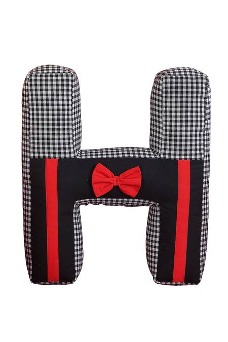 Black ''H'' shaped cushion with checkered pattern and a red bow.