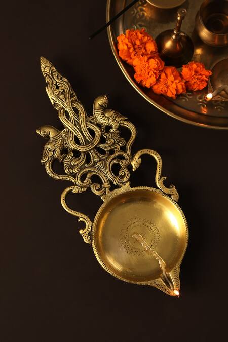 Antique gold handcrafted diya in brass base with bird & jaali carved handle.