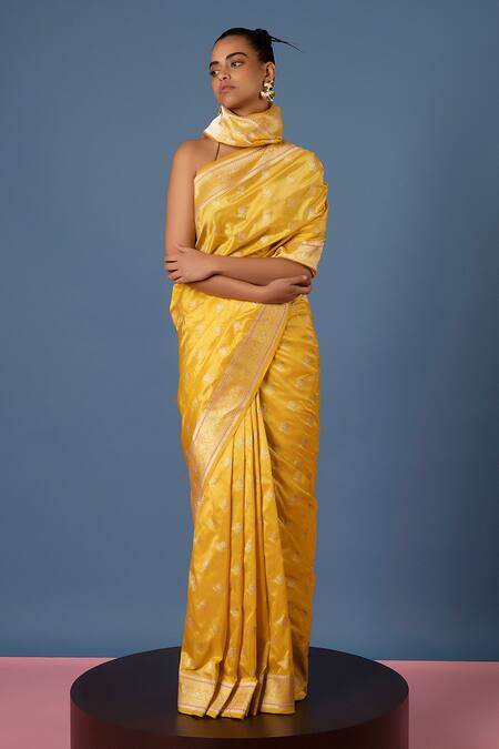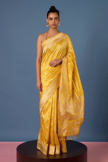 Yellow floral pattern handwoven saree in silk base, inspired by Meenakari craft. Accompanied by a handwoven silk unstitched blouse piece.