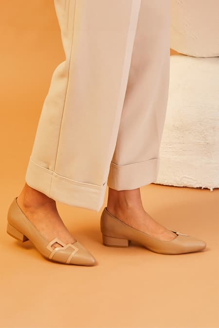 Beige mule block heels featuring cutwork and pointed toe detailing