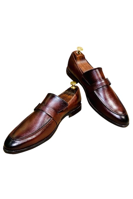 Brown handcrafted loafers with single buckle & handsprayed tan finish .