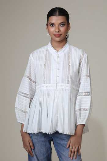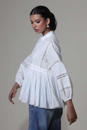 Ivory Cotton, Voile Embroidery Mandarin Collar Ira Lace Insert Top
