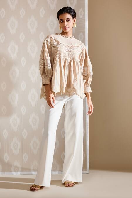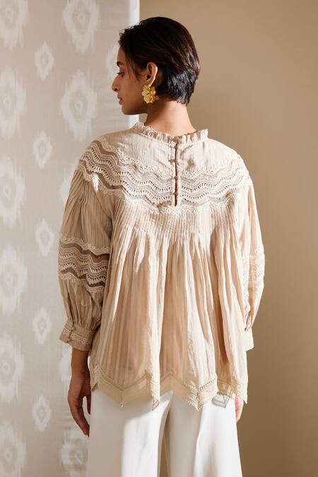 Beige pleated top with lace details across the chest, sleeves and hem and ruffle on the collar.