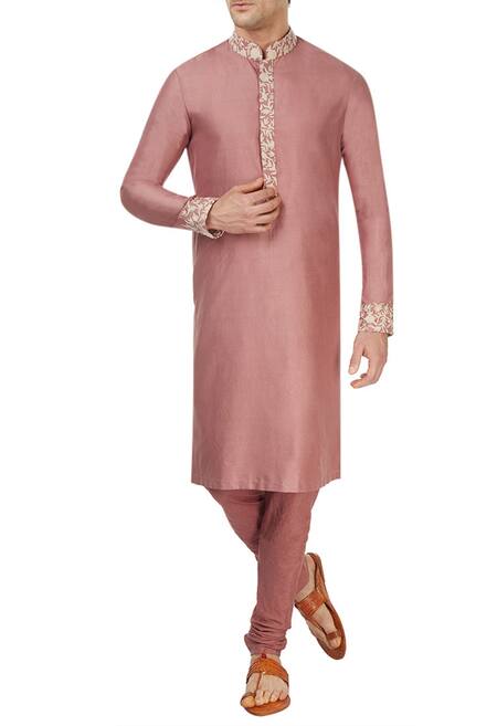 Pink kurta with floral embroidered placket, band collar and cuffs. Comes with pant.