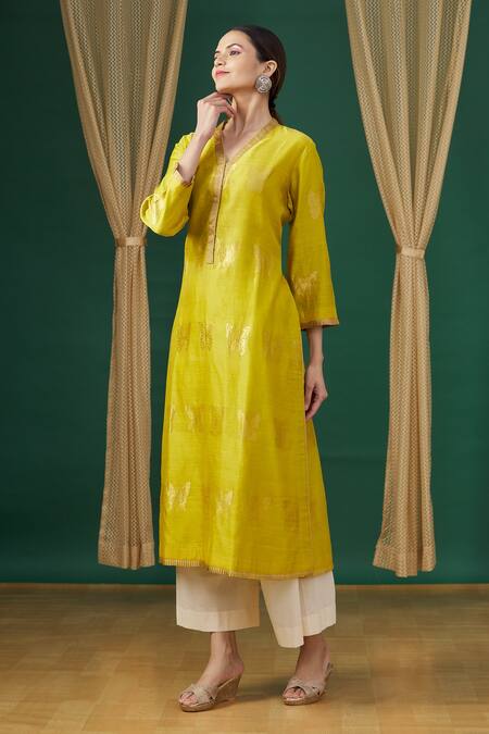Yellow V neck tunic with butterfly embroidered motifs & pleated sleeve hem.