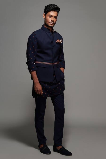 Navy blue Nehru jacket with faux leather belt on the waistband and shoulders.