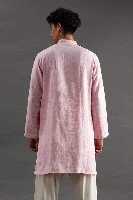 Pink Linen Pearls Placket Hand Embroidered Kurta And Pyjama Set