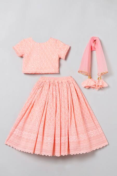 Pink lehenga set featuring sequins and thread embroidery. Comes with a matching blouse and dupatta with ruffled sleeve hems.