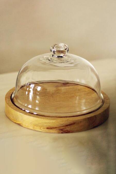 Brown circular-shape wooden cake platter with a glass dome-shaped cloche.