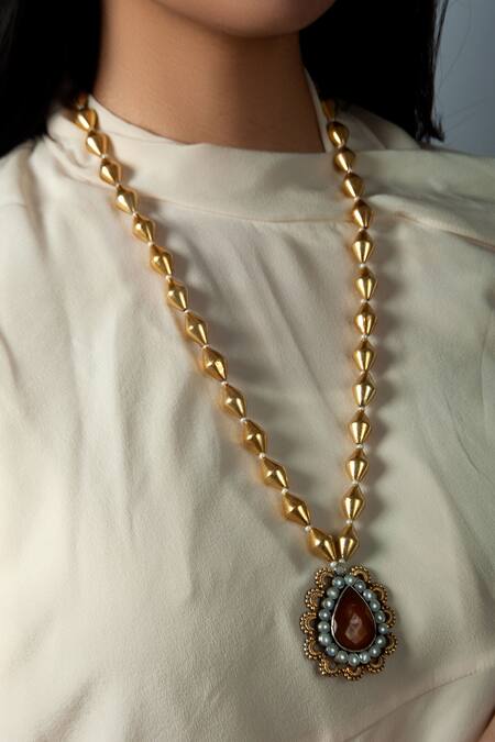 Gold & red chalcedony pendant necklace featuring a drop-shaped pendant embellished with pearls