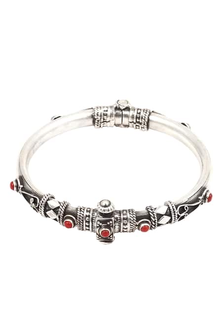 Silver bangle featuring intricate carvings and red stone embellishments