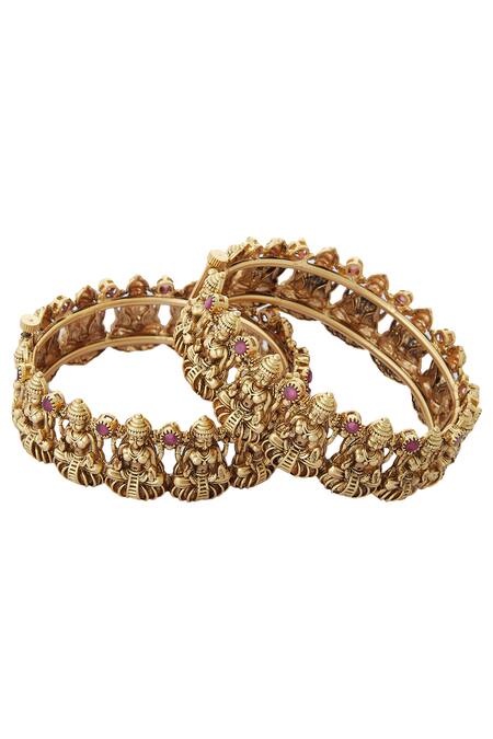 Antique gold-plated bangles & goddess carved bangles embellished with pink stones.