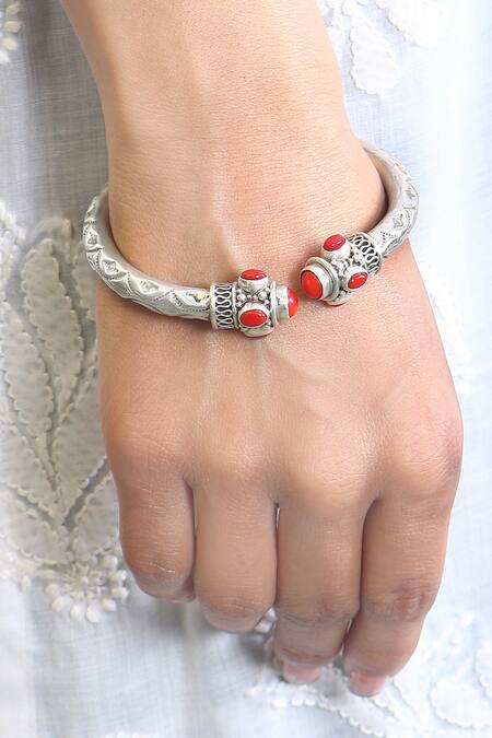 92.5 sterling silver plated twister bangle with red stone embellishments and carved detailing.