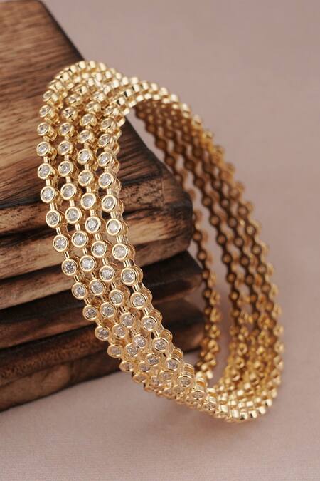 Gold Plated Carved Geometric Stone Embellished Bangles - Set Of 4