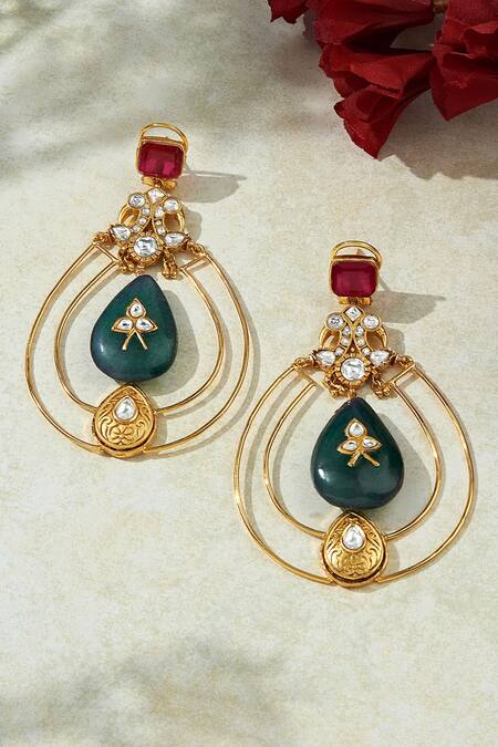 Gold tone earrings in intertwined circular pattern with kundan and polki embellishments, highlighted with green and red onyx stones.