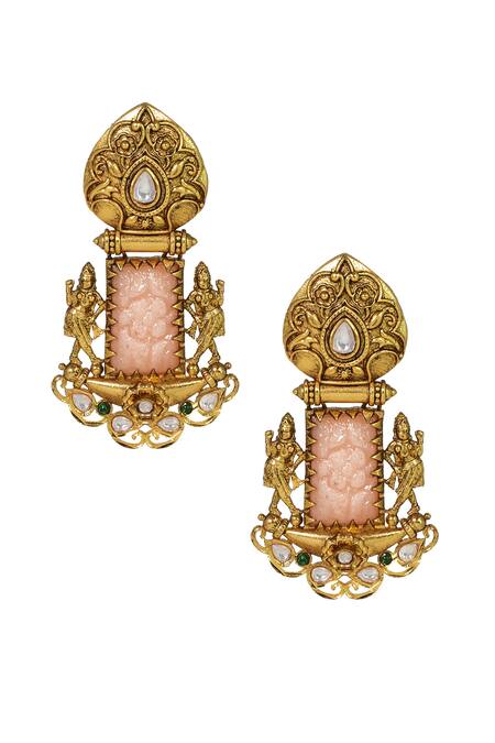Gold and pink carved stone antique earrings featuring intricate carved and cutwork details