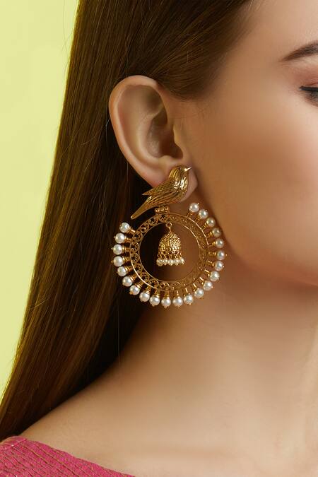 Buy_Just Shradhas_Gold Plated Pearls Carved Stone Hoops_Online_at_Aza_Fashions