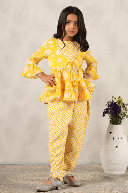Buy_Casa Ninos_Yellow Muslin Embroidery Zig Zag Print Jacket And Pant Set_at_Aza_Fashions